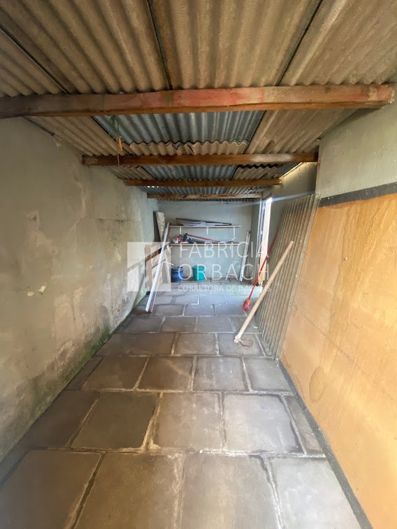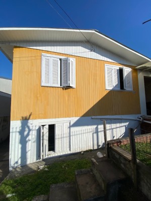 Estrutura de madeira, área de serviço, banheiro social, sala, churrasqueira, cozinha, garagem fechada, pátio. Parte inferior da casa em alvenaria com três dormitórios, sala, cozinha, área de serviço e banheiro. Toda cercada.