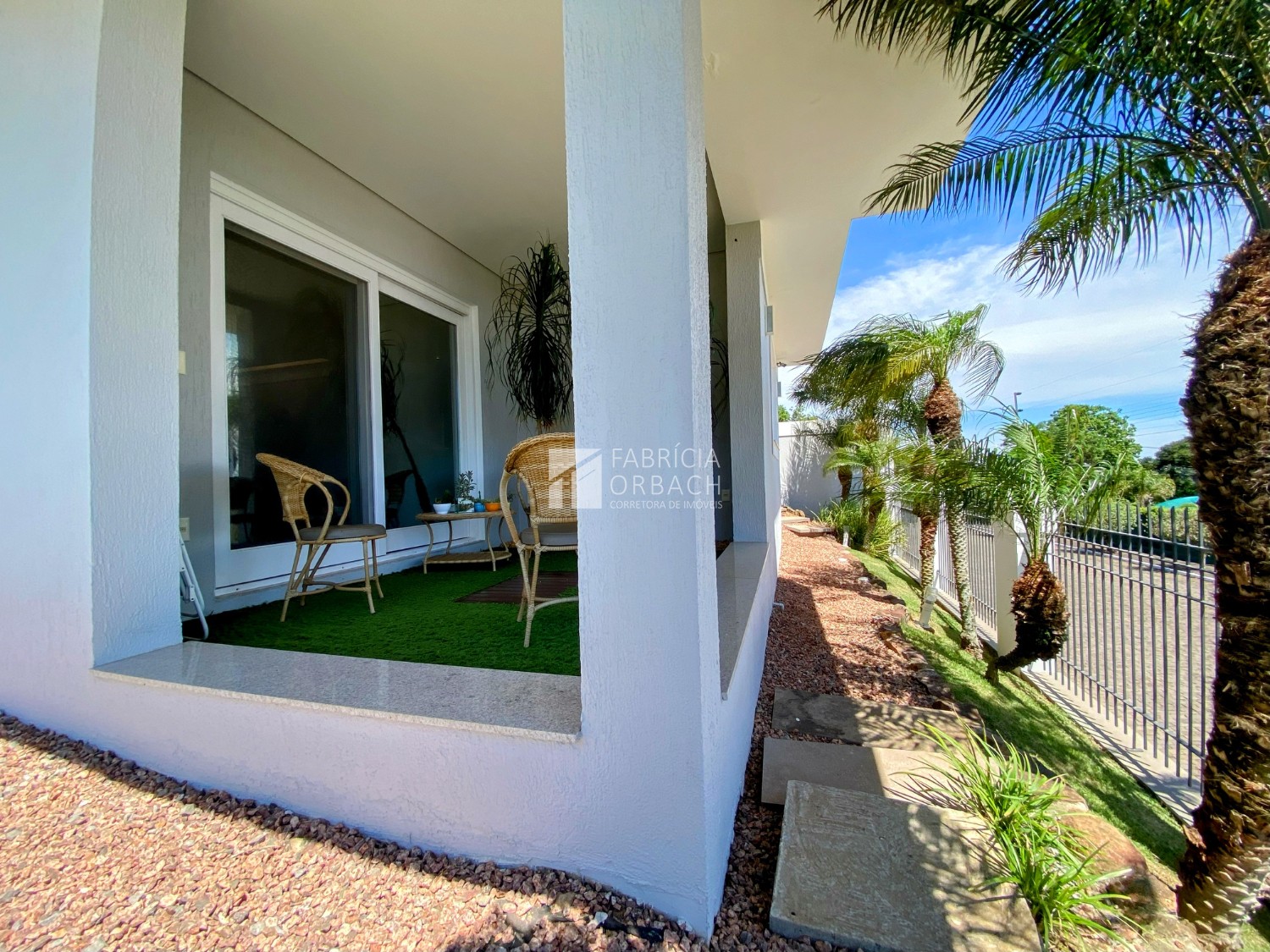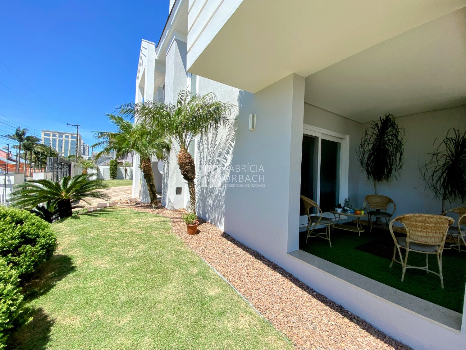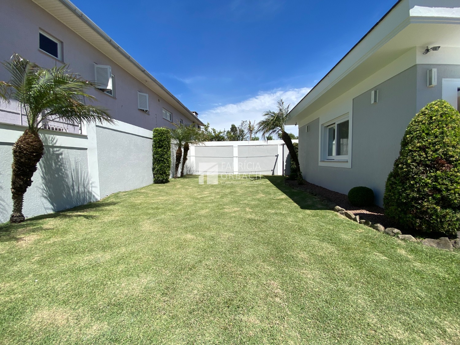 Pátio com gramado e árvores ornamentais, criando um cenário encantador para o seu dia a dia
