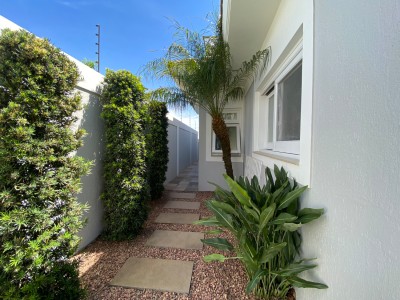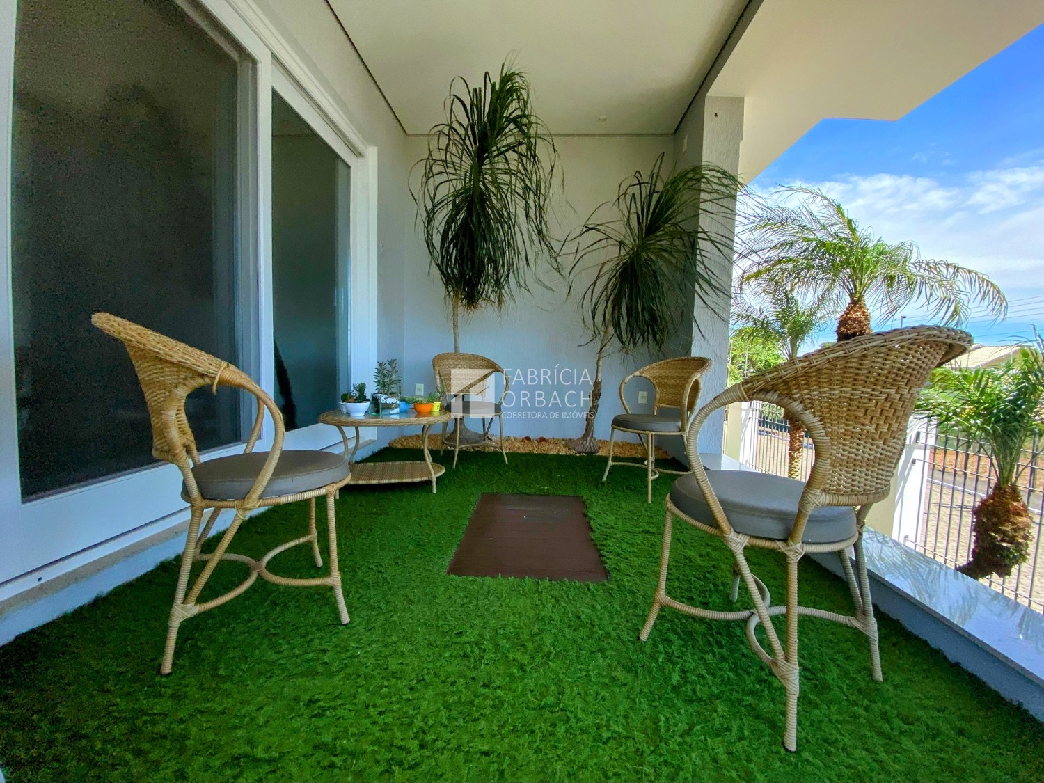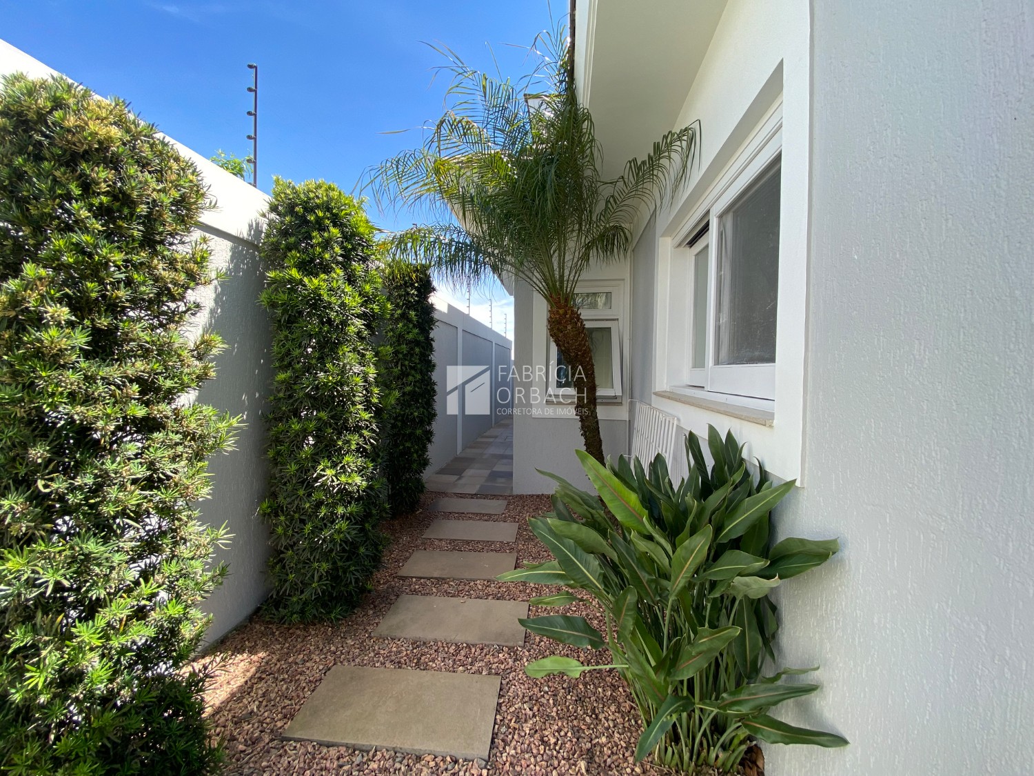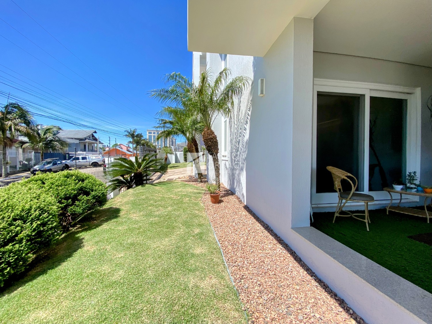 Pátio com gramado e árvores ornamentais, criando um cenário encantador para o seu dia a dia