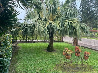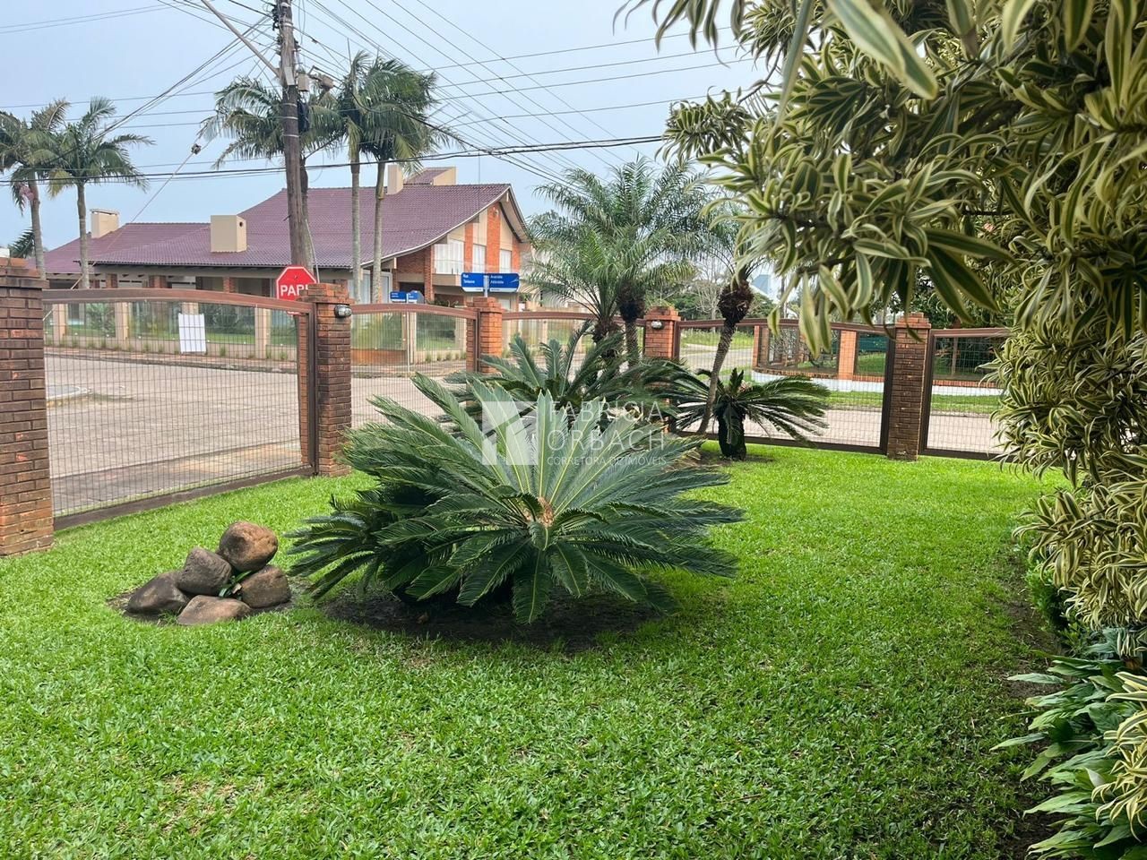 - Jardim com gramado, jardim e árvores.