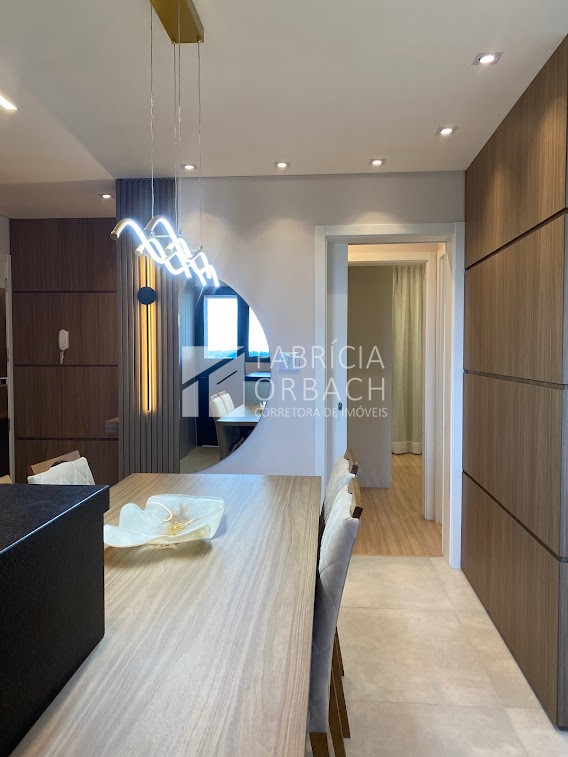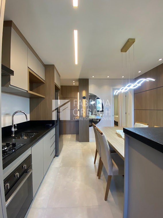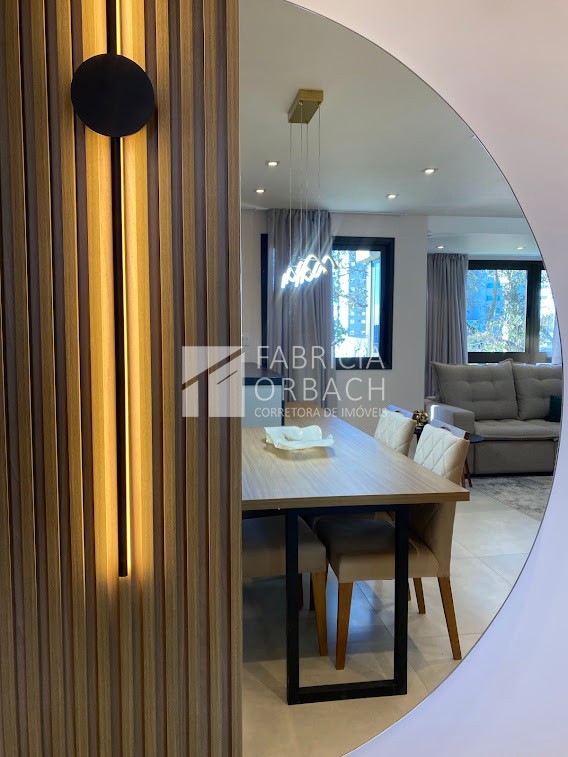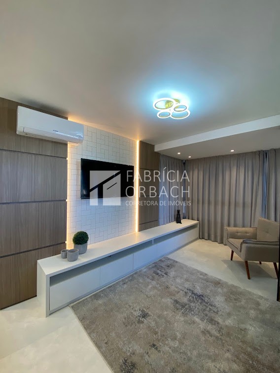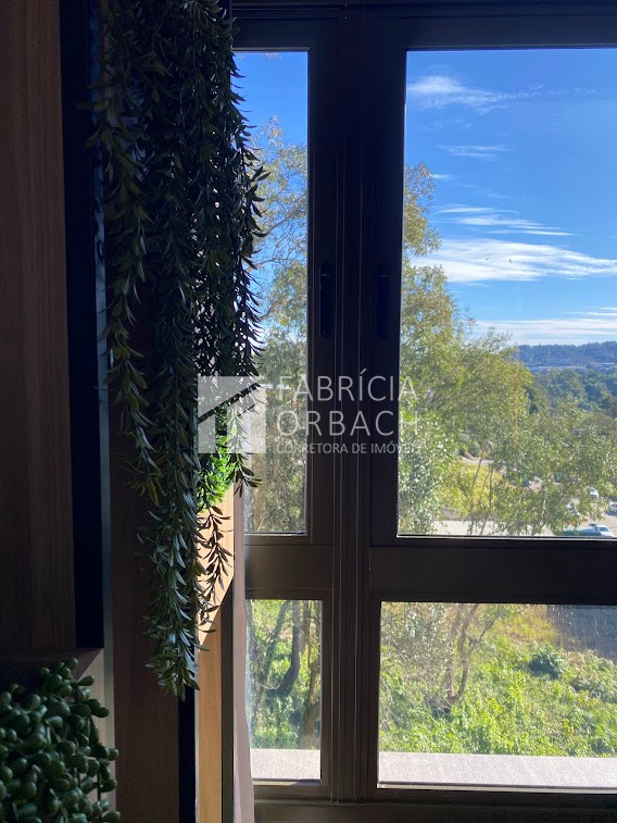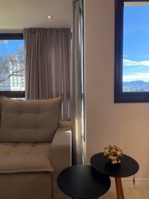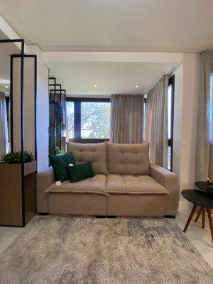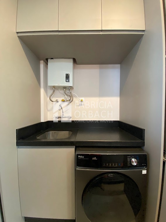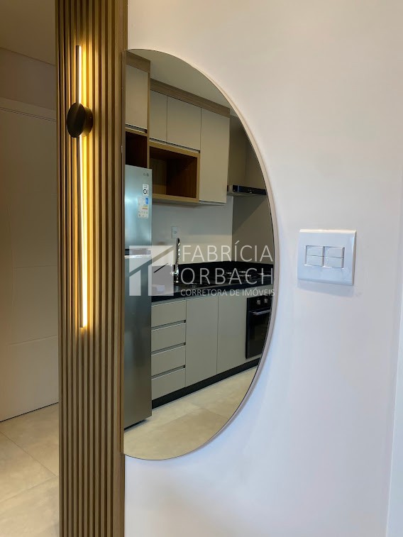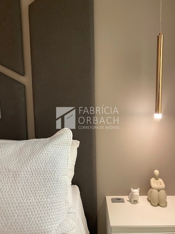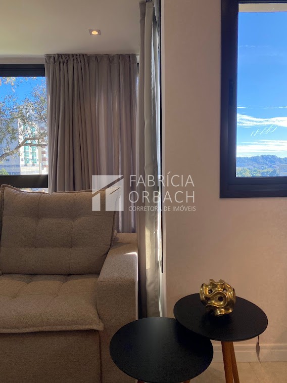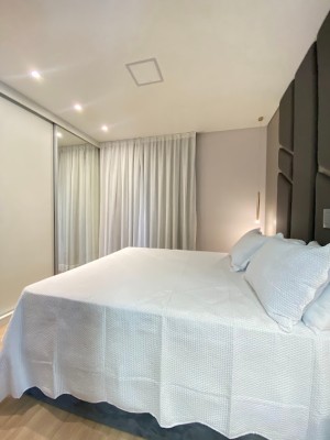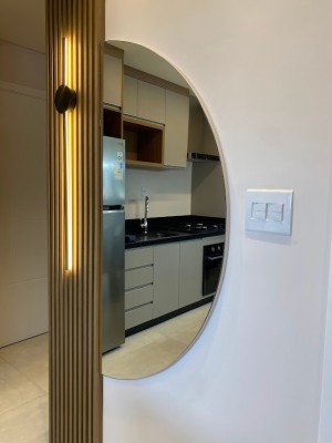 Mobiliado, o apartamento conta com 2 dormitórios, sendo 1 suíte, e 2 banheiros. Possui sacada aberta com churrasqueira.