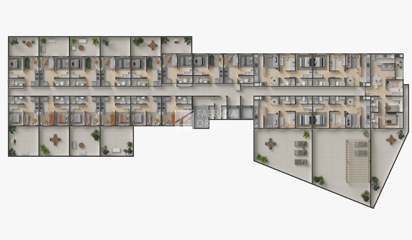 > Unidade 01 dormitório, um terraço privativo. Área privativa de 26,11m² e 28,78m² de terraço. Área privativa total da unidade: 54,89m².
