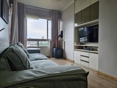 Descrição › Localizado no bairro São João, em Bento Gonçalves, este apartamento de 2 dormitórios. Com uma área total de 74,07m² e área privativa de 56,30m², o imóvel conta com esquadrias em alumínio, elevador, portão eletrônico, portaria 24hs, rede/internet, salão de festas, circuito interno de câmeras, guarita com controle de acesso, pavimentação com blocos de concreto, totalmente cercado, área de serviço, banheiro social, cozinha, garagem, interfone, jantar e estar integrados, lareira e medidores individuais.