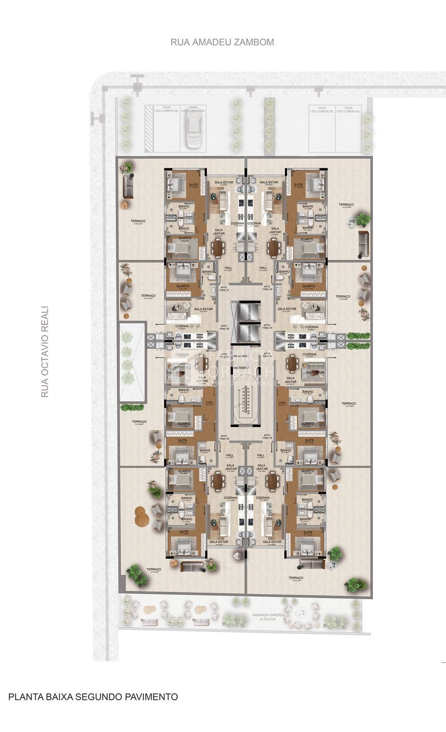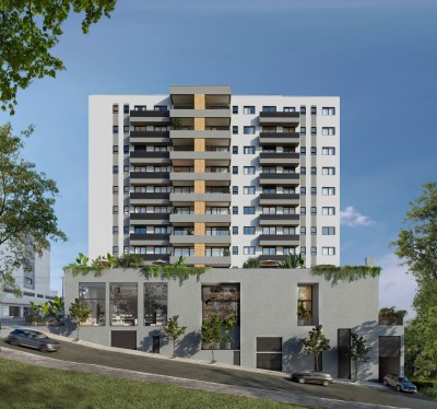 - Oito apartamentos por pavimento: 6 unidades de 2 dormitórios + 2 unidades de 1 dormitório.