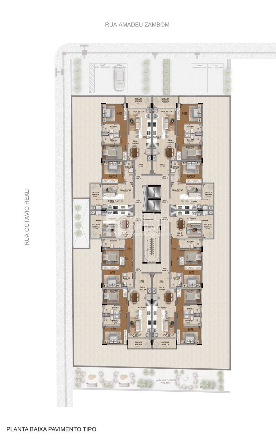 - Oito apartamentos por pavimento: 6 unidades de 2 dormitórios + 2 unidades de 1 dormitório.