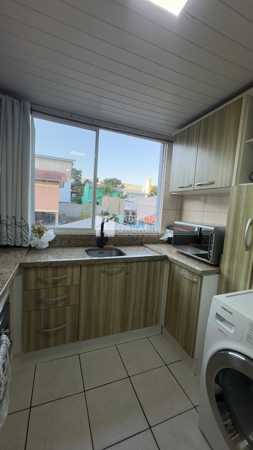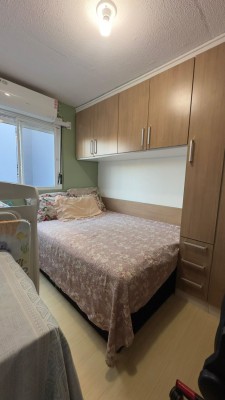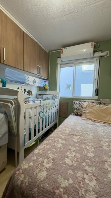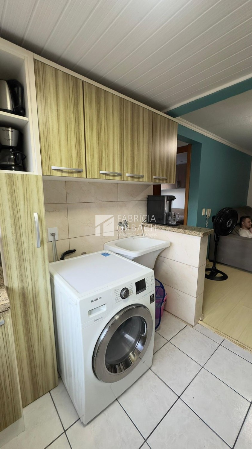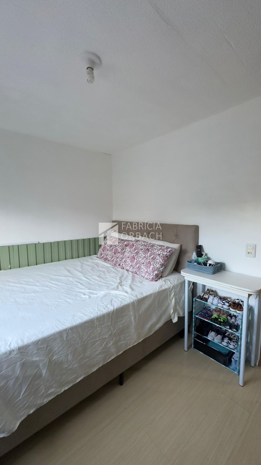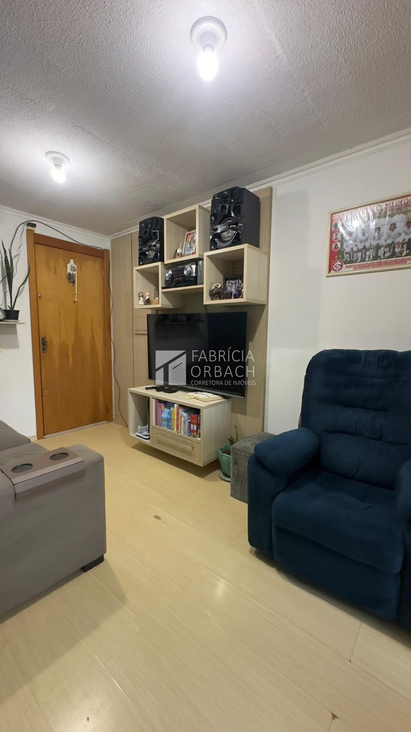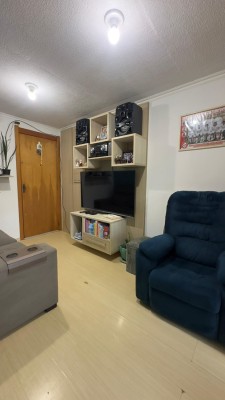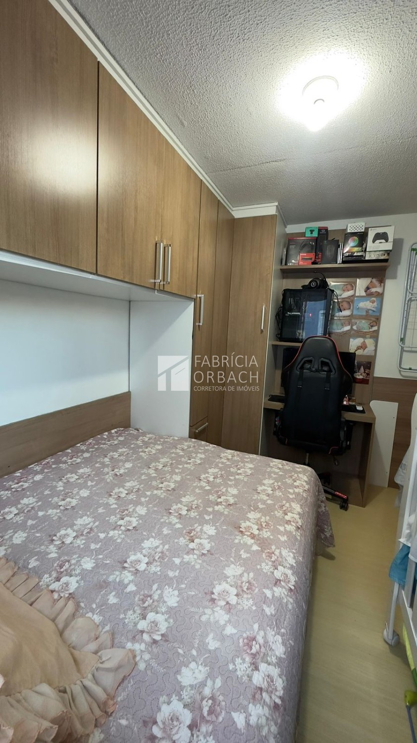 Descrição › Apartamento localizado no terceiro andar (residencial sem elevador), o imóvel oferece 42 m² privativos, distribuídos em dois dormitórios, sala de estar, banheiro social e cozinha com lavanderia integrada.