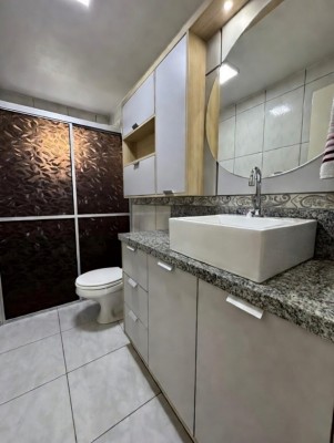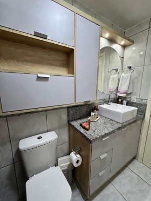 • Permanecem os móveis sob medida do banheiro e da cozinha.